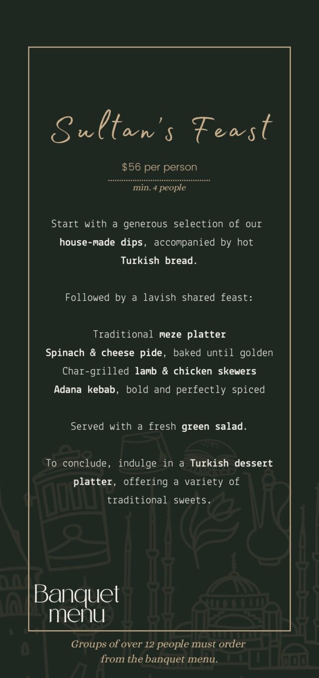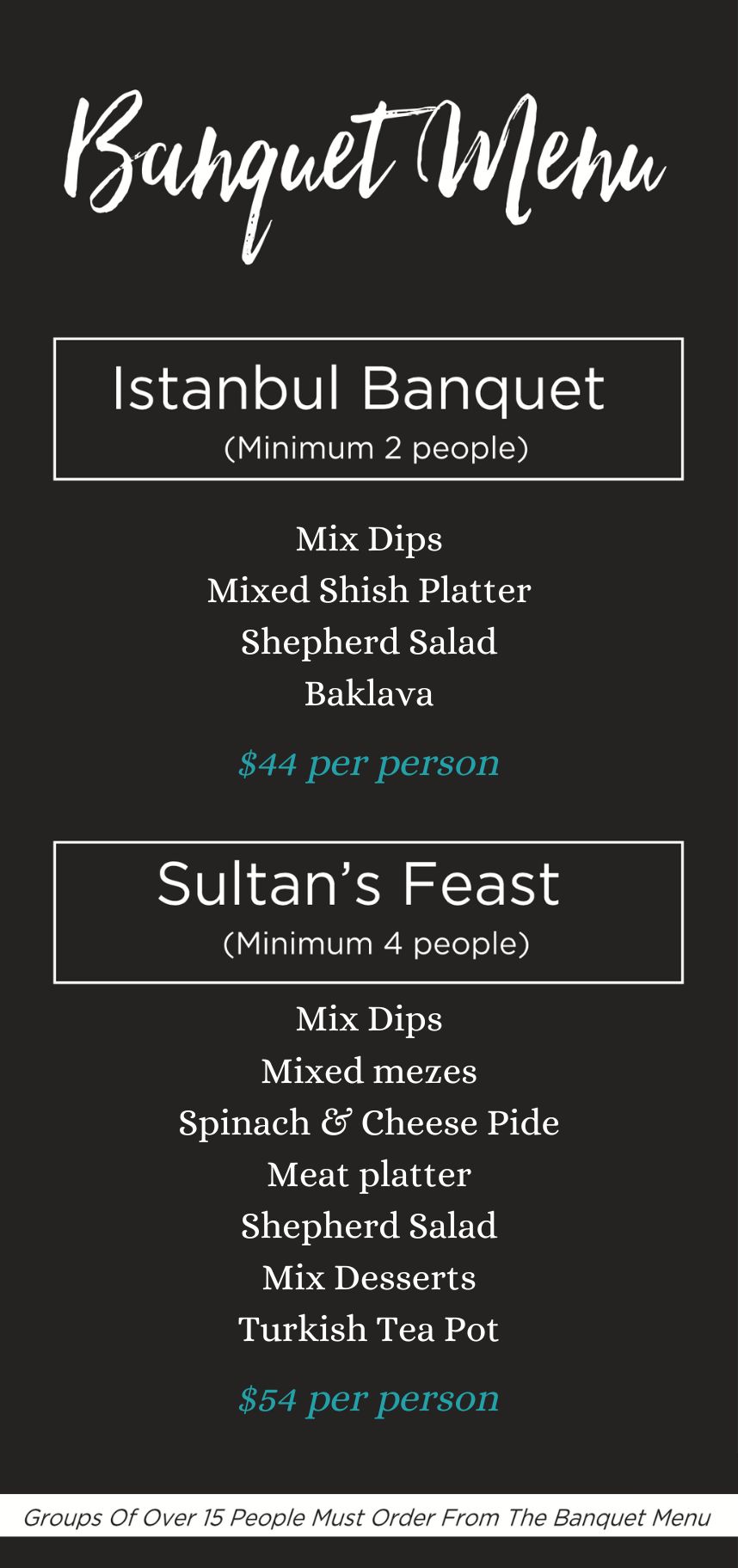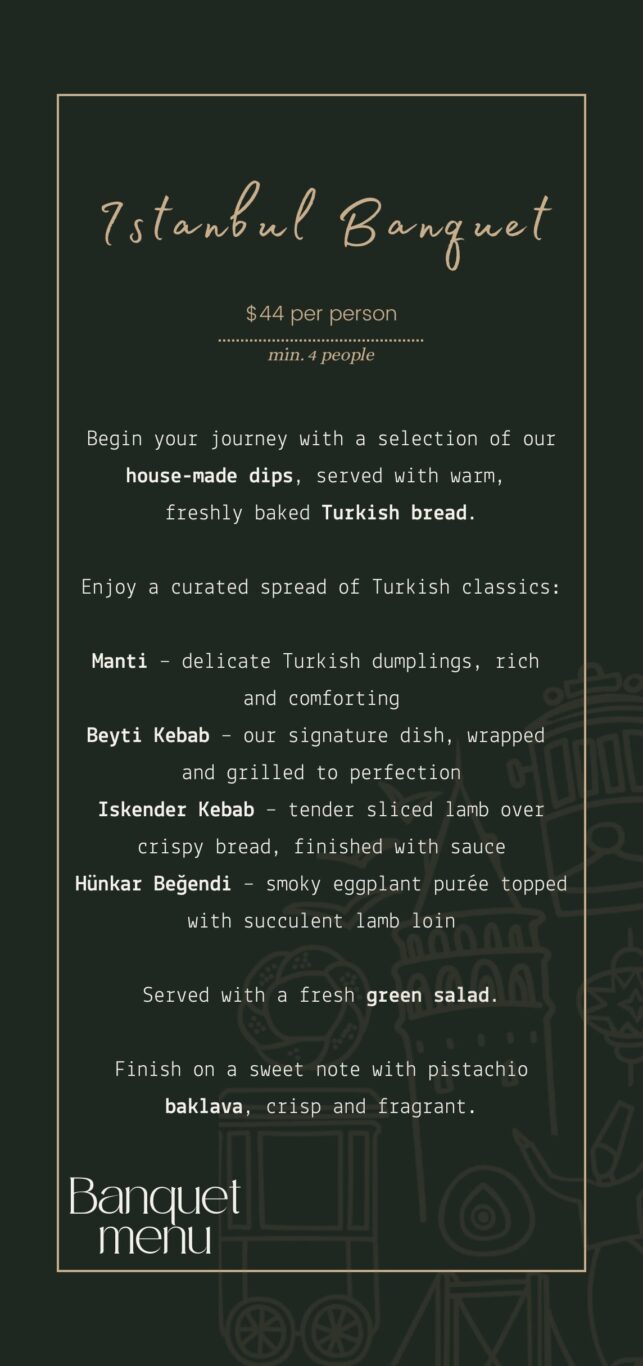 Our banquet menu is perfect for groups starting from as little as 4 people. You will taste the delicacies of Turkish cuisine whilst leaving with a full stomach.